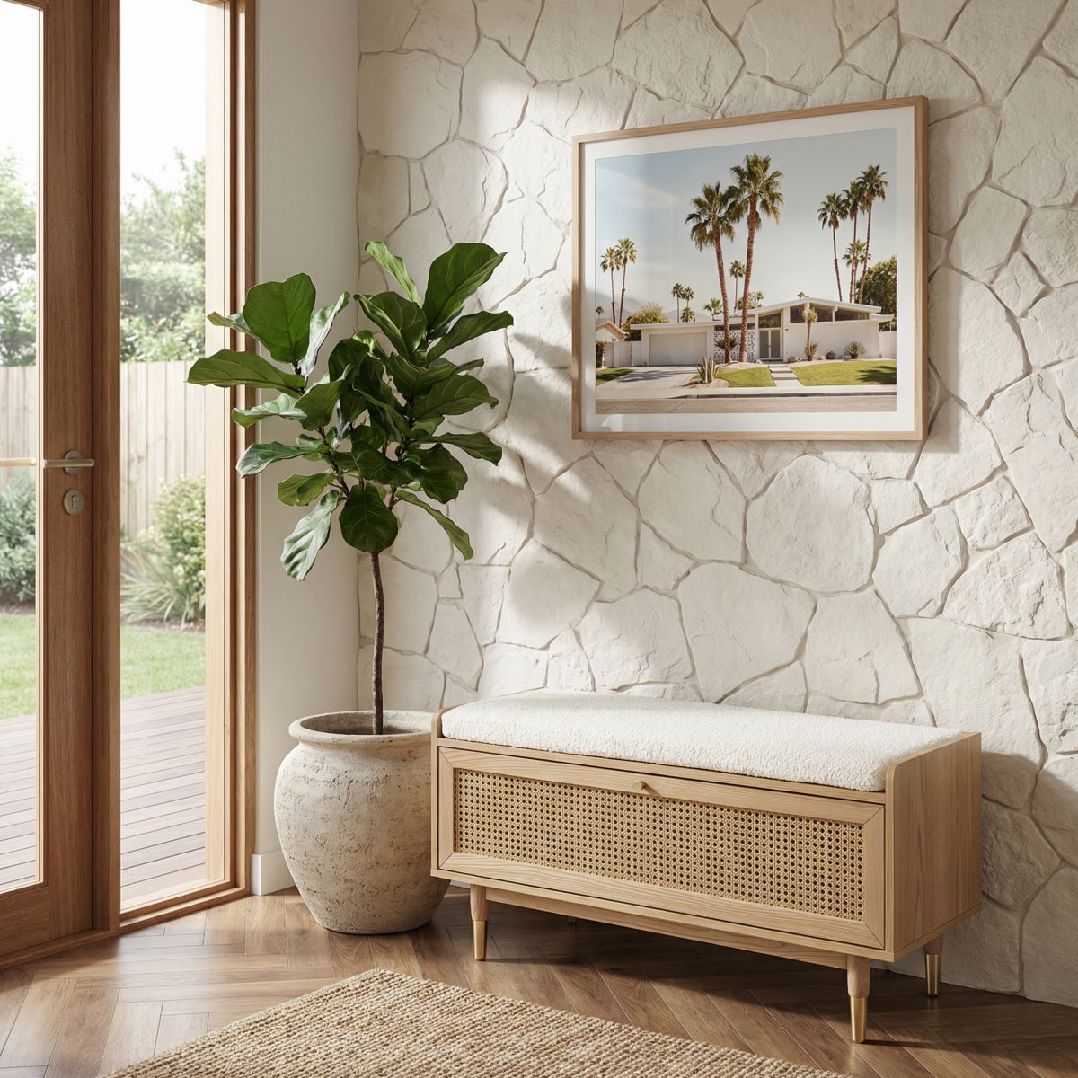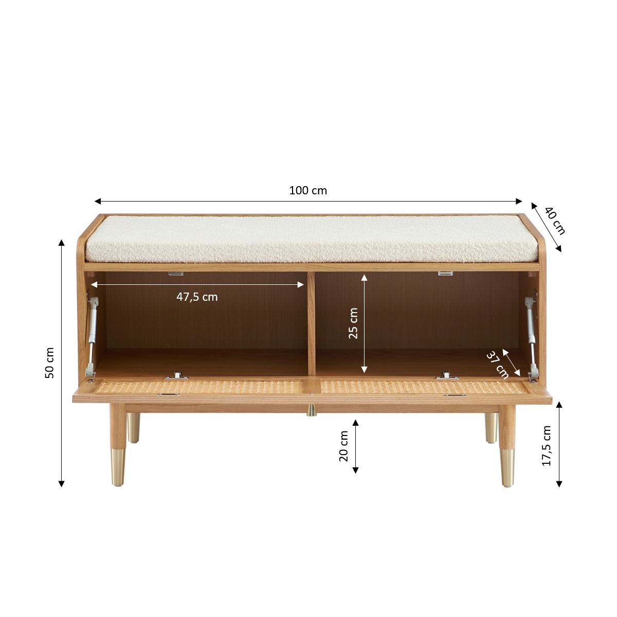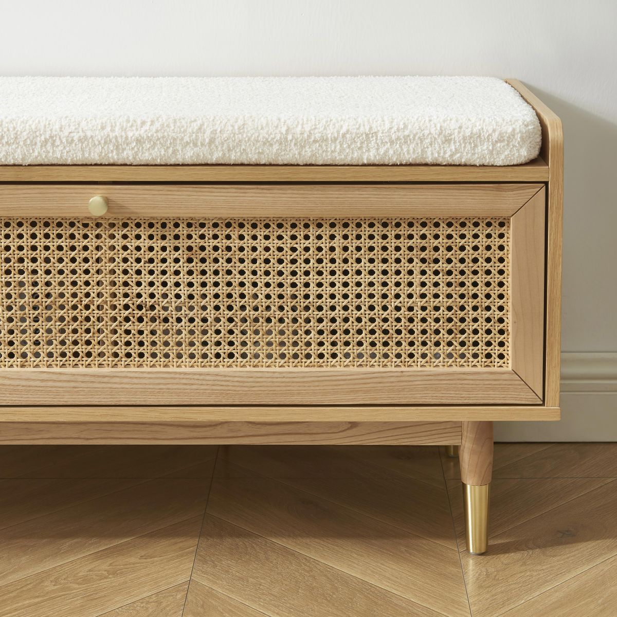 Doté d'un coussin en tissu bouclettes écru, le banc à chaussures LÉON vous offre la possibilité de vous chausser dans le plus grand des conforts. Pour finir, on aime ces détails en laiton doré, qui font toute la différence.