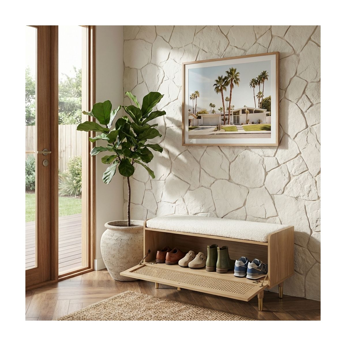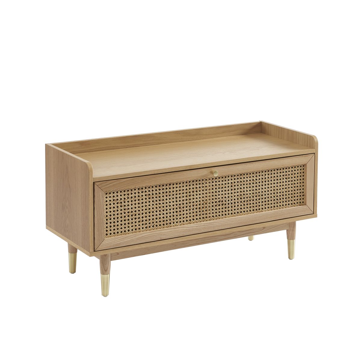 Un design chic pour un meuble à chaussures très pratique ! Le banc à chaussures LÉON, avec sa porte battante en cannage, vous permettra de ranger jusqu'à 14 paires de chaussures.