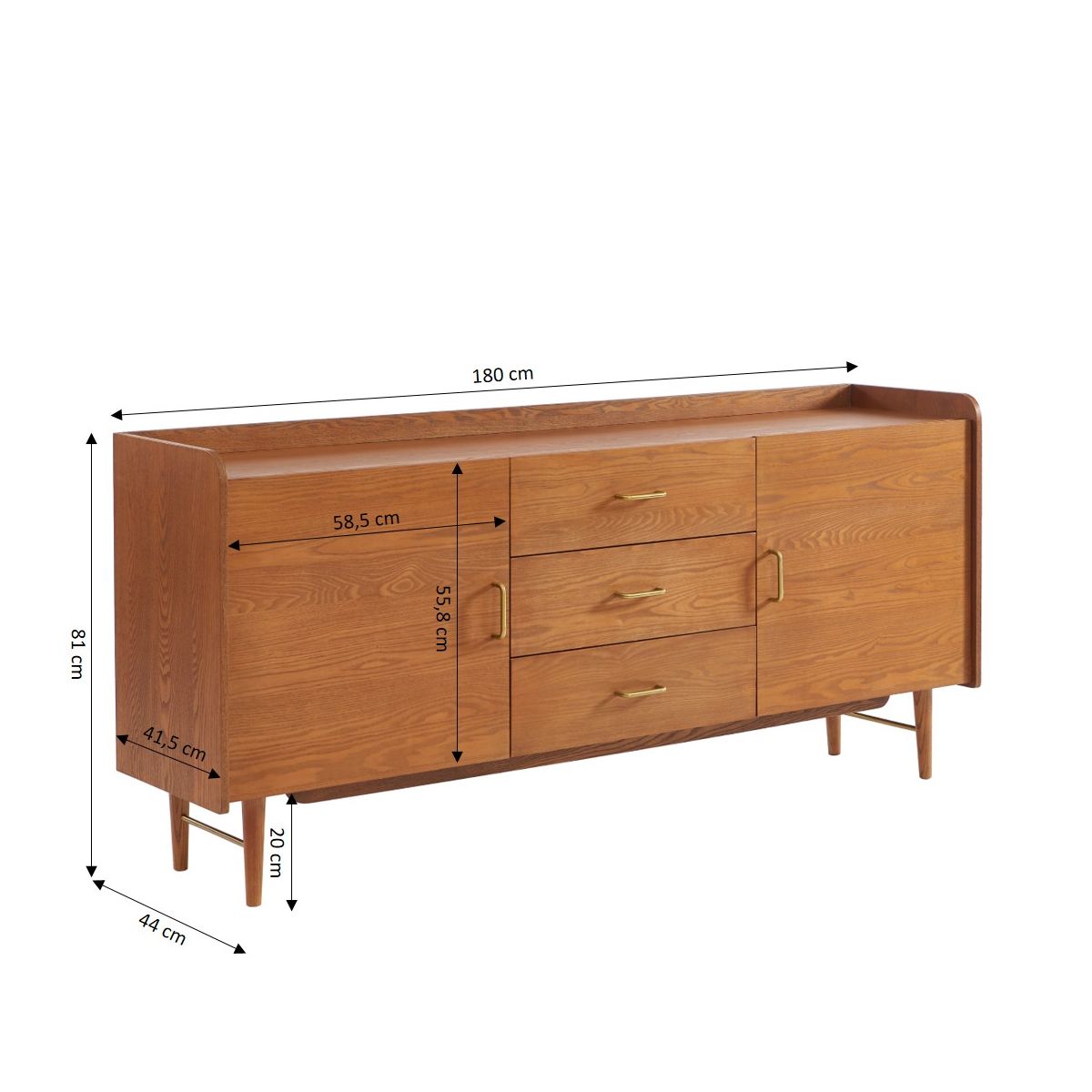 Ce buffet repose sur un piètement en bois massif, qui garantit sa stabilité tout en ajoutant une touche naturelle et authentique à l'ensemble. Les poignées en métal finition laiton apportent une note élégante et moderne, créant un contraste avec la teinte chaleureuse du frêne.