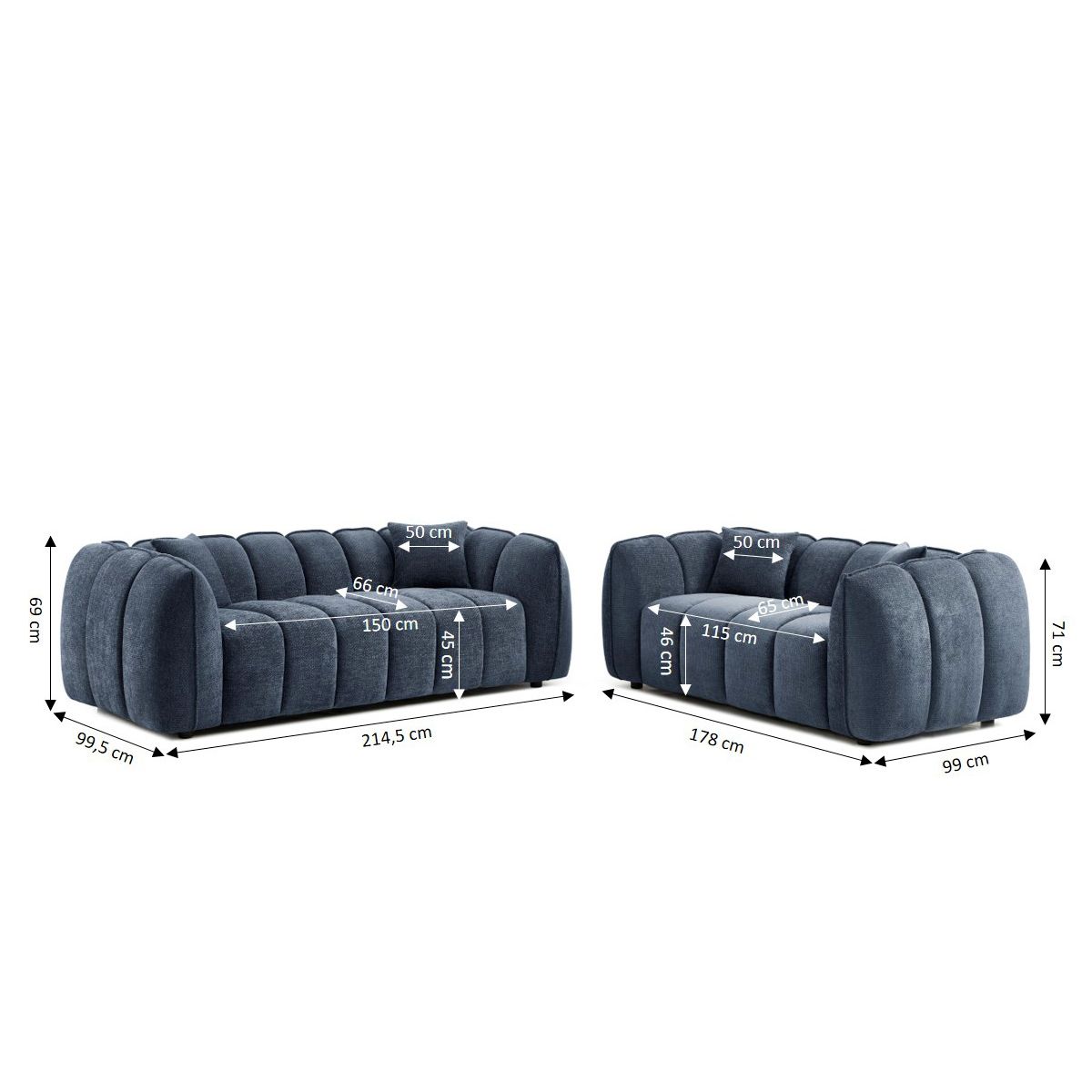 Canapé 3 places : L214.5 x P99.5 x H69 - Canapé 2 places : L178 x P99 x H71
