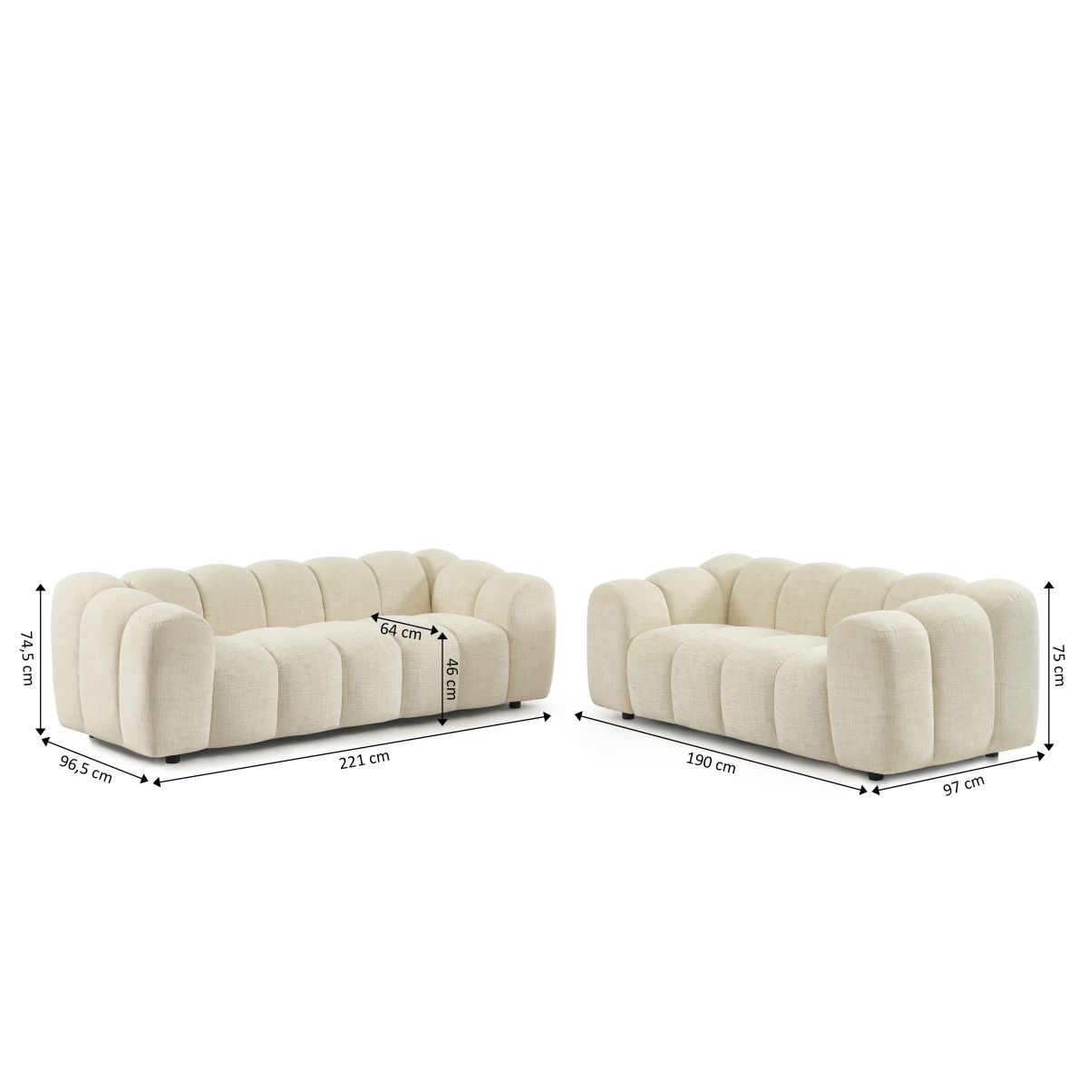 Canapé 3 places : L221 x P96,5 x H74,5 - Canapé 2 places : L190 x P97 x H75