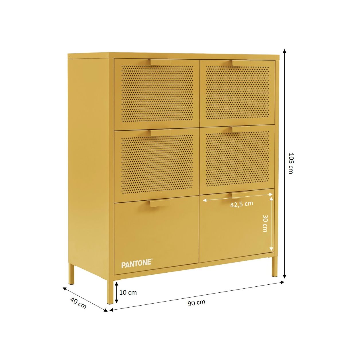 La commode PANTONE est équipée de six tiroirs, offrant ainsi un espace de rangement pratique et organisé pour vos affaires. Les quatre tiroirs du haut ont une façade en métal perforé, ajoutant une touche de texture au design de la commode, tandis que les deux tiroirs du bas ont une façade en métal pleine pour un look plus solide et traditionnel.