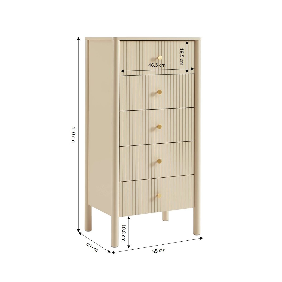 Compact et élégant, le chiffonnier CLEO séduit par ses 5 tiroirs cannelés, ses pieds en frêne massif et ses poignées dorées. Une solution de rangement moderne et pratique pour les petits espaces.