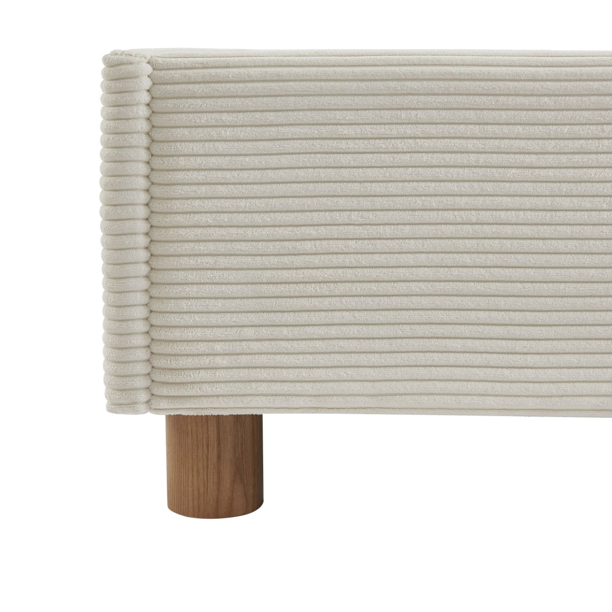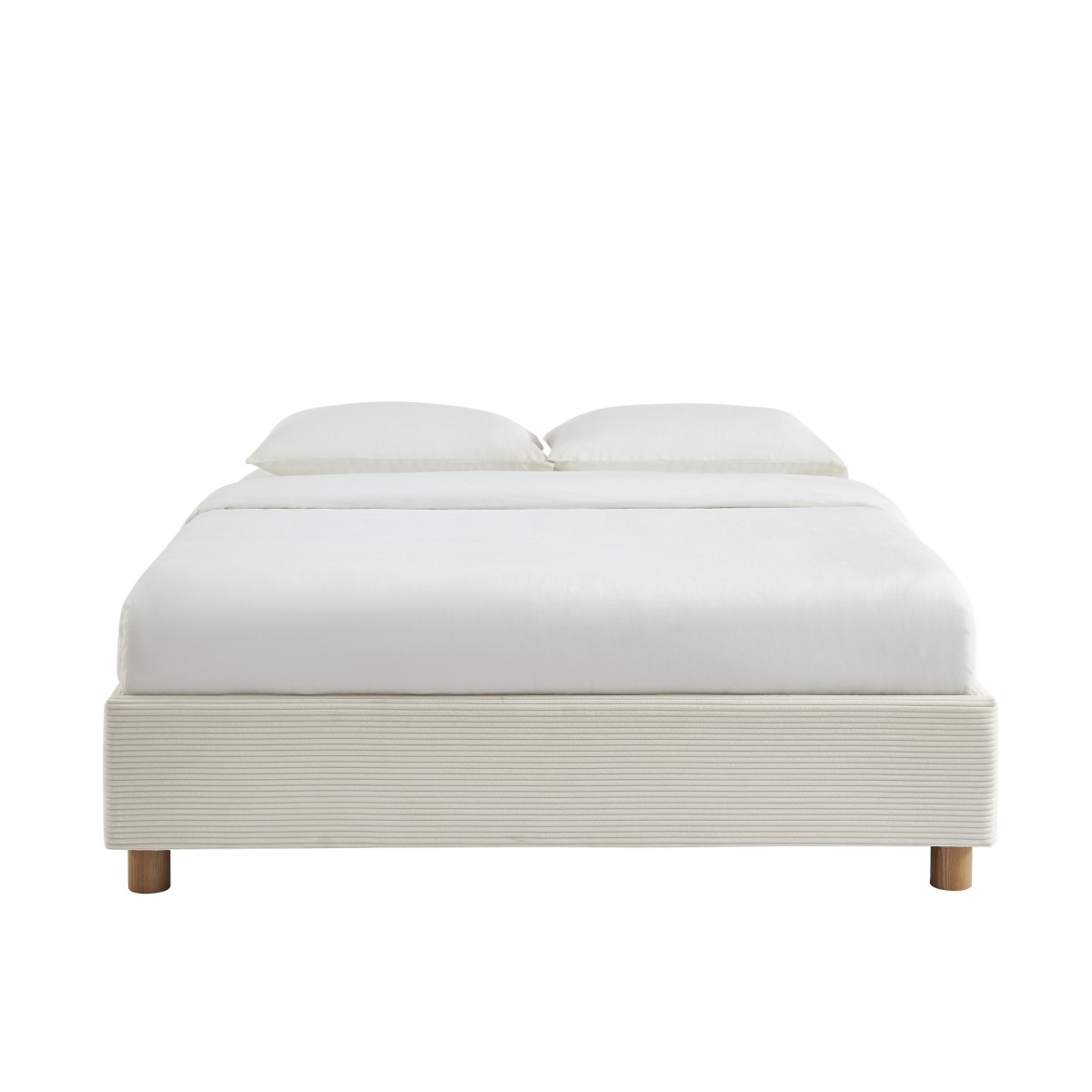 Plusieurs finitions et coloris sont disponibles sur ce modèle. Ainsi, la laine bouclée écrue apporte une texture douce et un aspect naturel tandis que le lin beige offre une touche de simplicité et d'élégance. Le velours côtelé bordeaux ajoute une profondeur de couleur, par contraste avec le velours côtelé écru, plus neutre et doux. Enfin, le tweed taupe donne une esthétique classique et intemporelle au lit KORALL.