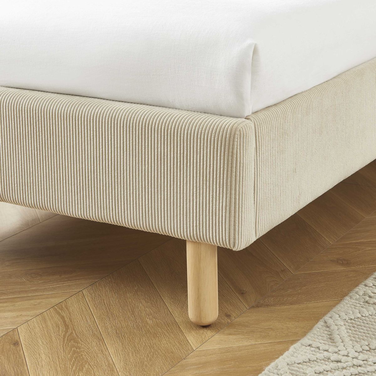 Les pieds du lit sont en bois d'hévéa massif, assurant ainsi une stabilité optimale et une durabilité certaine. Ce mélange de velours côtelé et de bois naturel confère au lit MAGNUS un style à la fois contemporain et scandinave, caractérisé par des lignes simples, des matériaux naturels et une palette de couleurs douces.