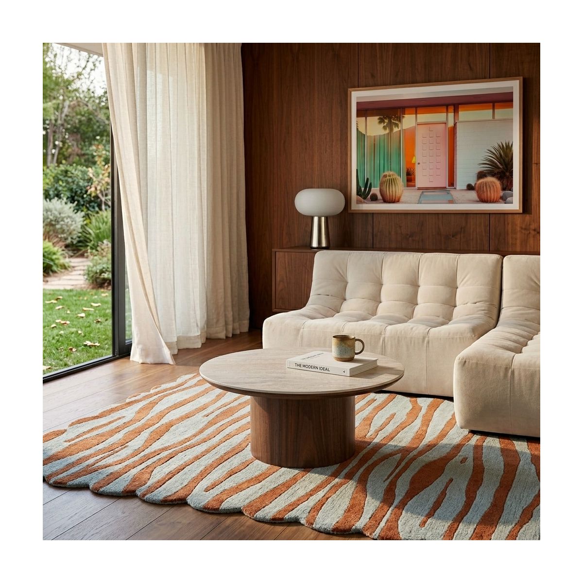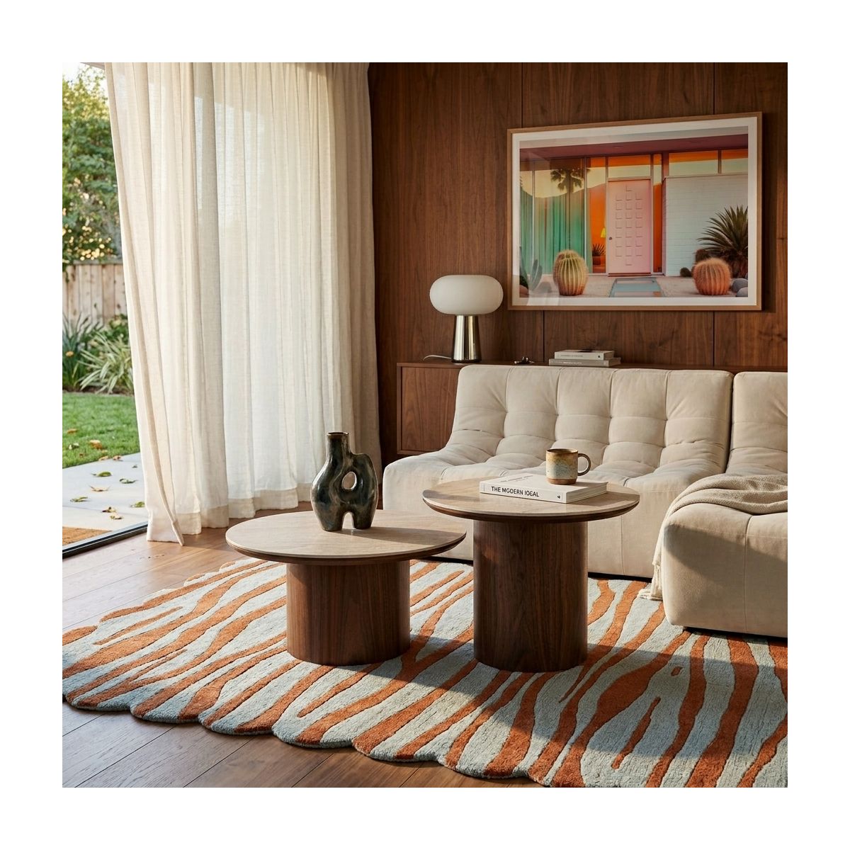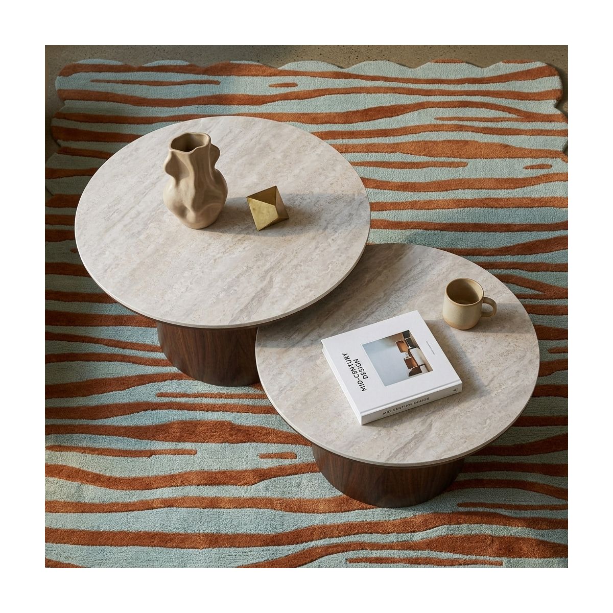 La structure en MDF associée au piètement plaqué noyer offre un rendu proche du bois naturel avec des nuances chaleureuses. Ce contraste entre la chaleur du bois et l'aspect minéral permet à la table basse LOFA de s'adapter aussi bien à un salon moderne que plus intemporel.