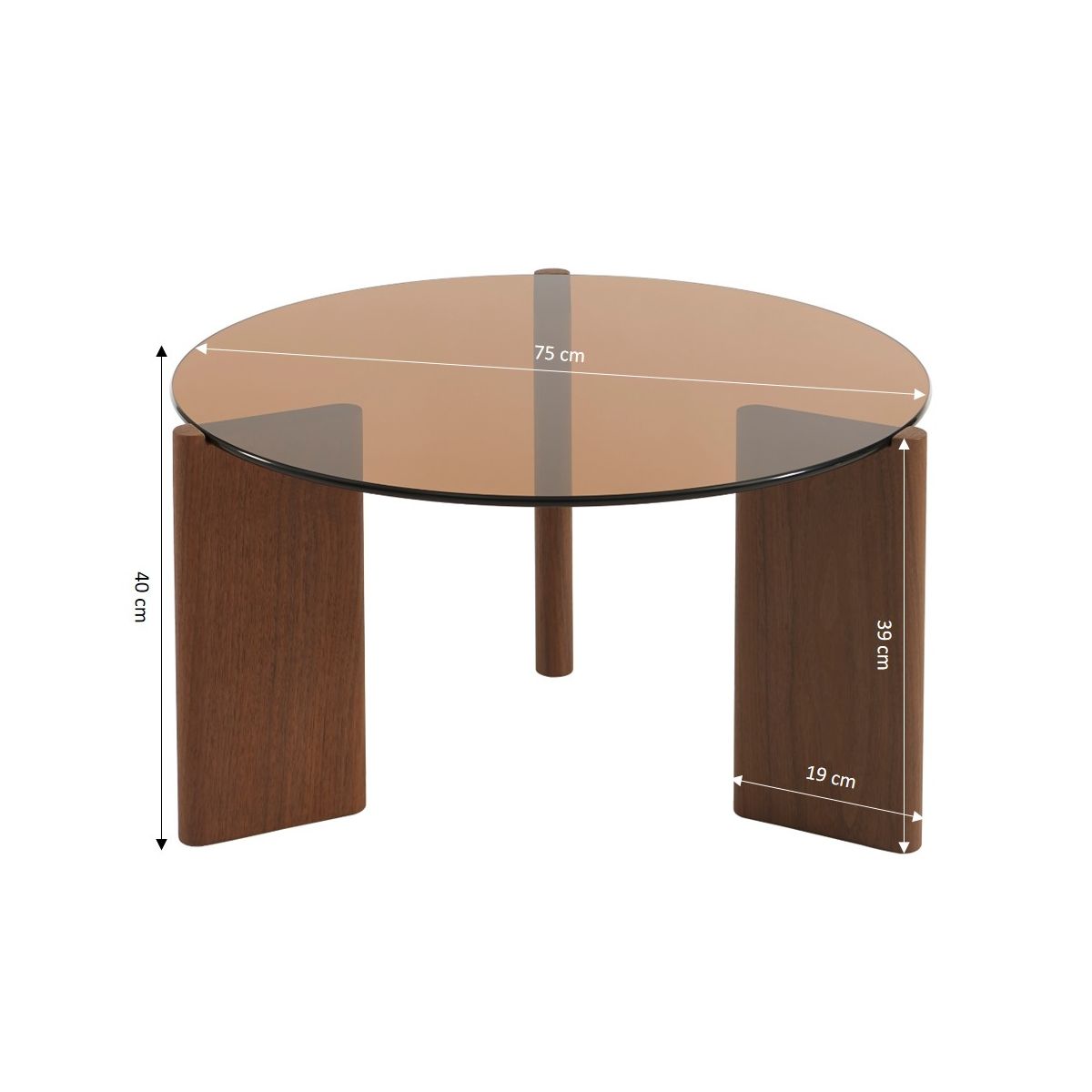 La table basse OLIE allie originalité et élégance avec son plateau en verre trempé caramel et ses pieds en placage noyer au design unique.