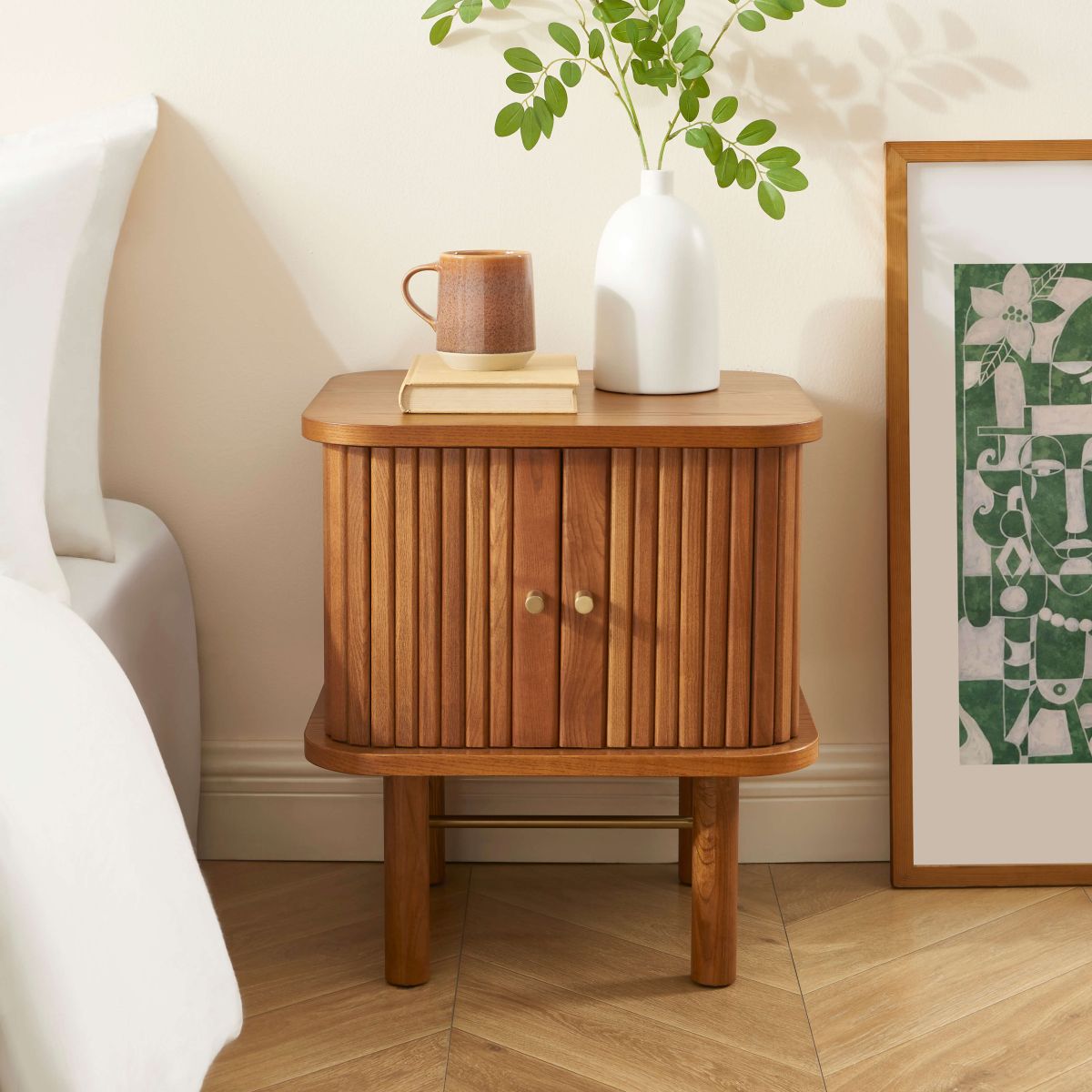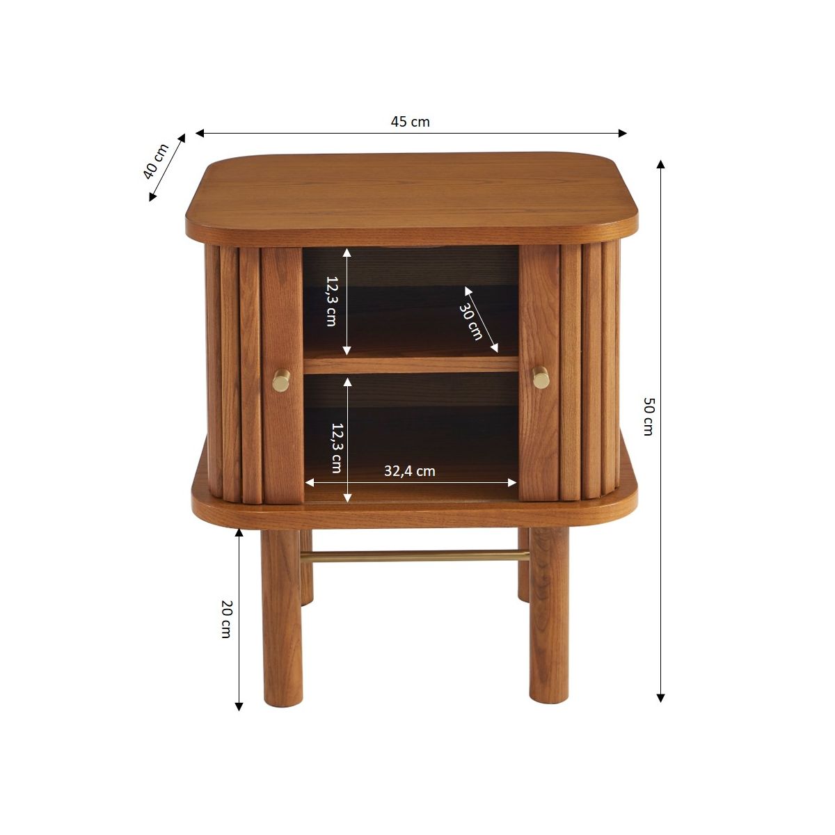 Avec son placage frêne foncé chaleureux et ses portes tambour arrondies, la table de chevet ERNEST allie style naturel et praticité.