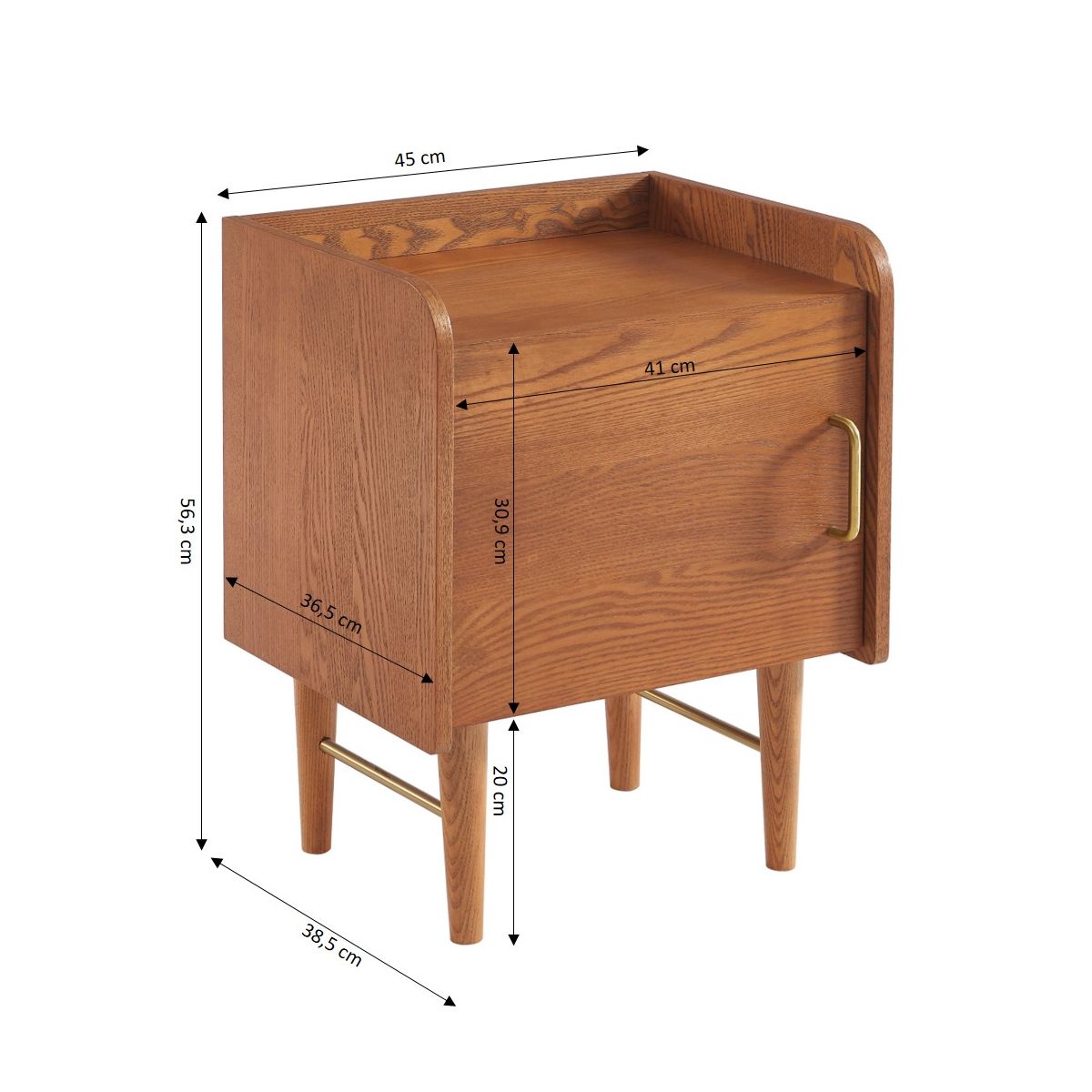 Ses pieds en frêne massif assurent stabilité et durabilité, tandis que les barres transversales en métal doré complétées par la poignée en métal dorée lui donnent un aspect élégant et moderne. Le mélange du bois brut et du doré rendent cette table de chevet moderne et intemporelle.