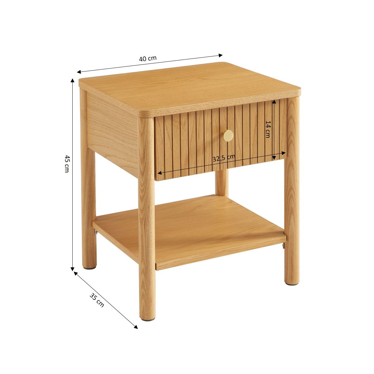 La table de chevet CLEO en placage chêne séduit par son tiroir cannelé, ses pieds en frêne massif et sa poignée dorée élégante. Compacte et raffinée, elle allie fonctionnalité et style naturel.
